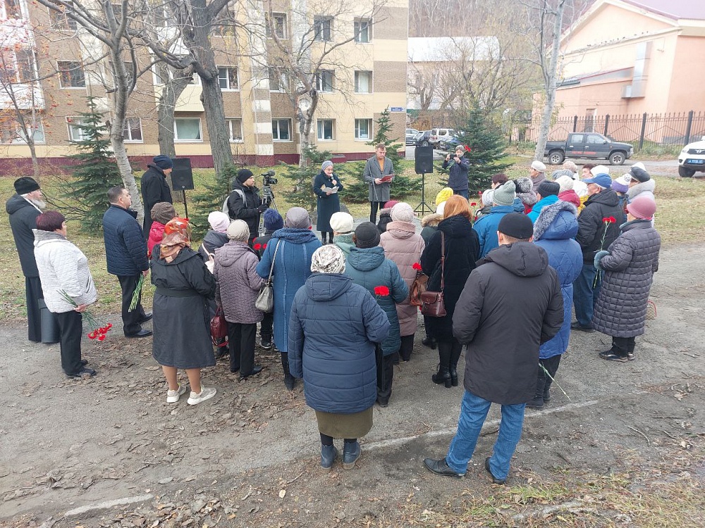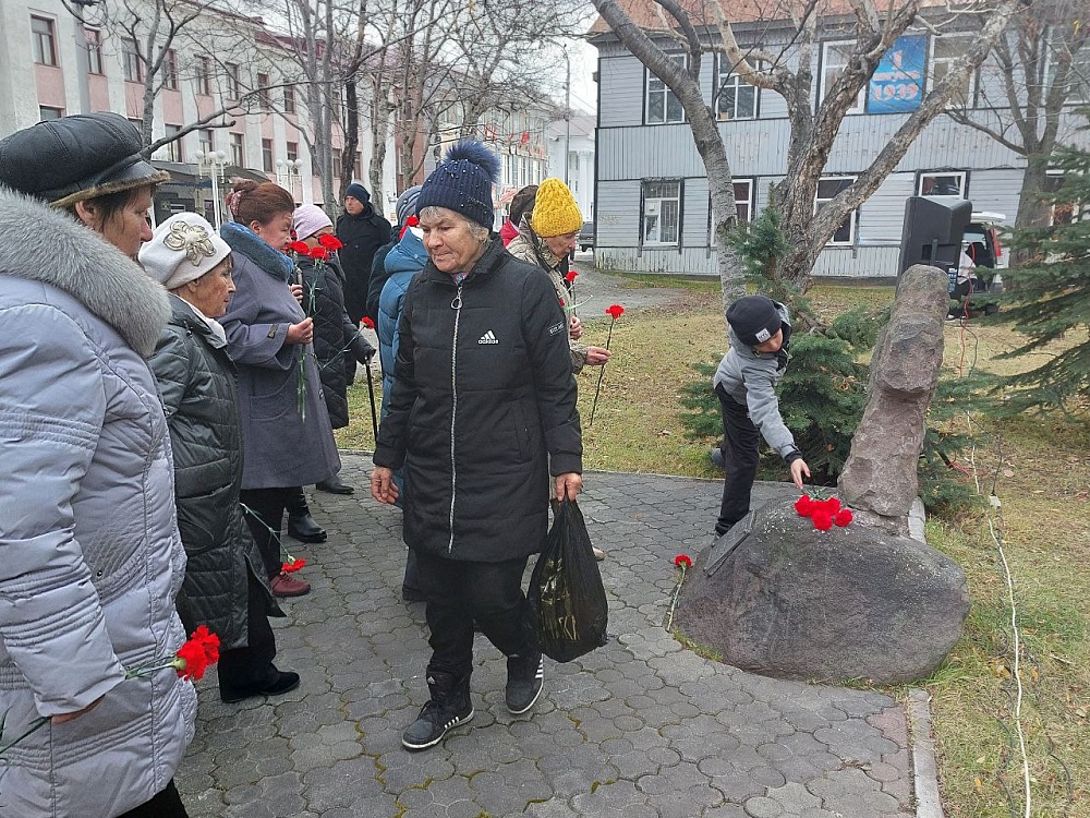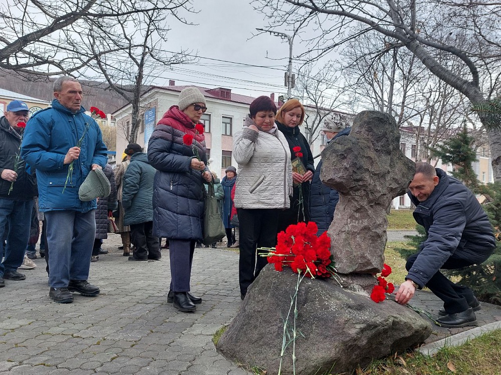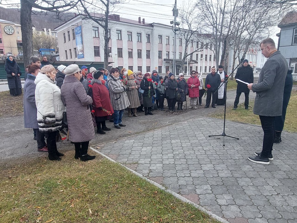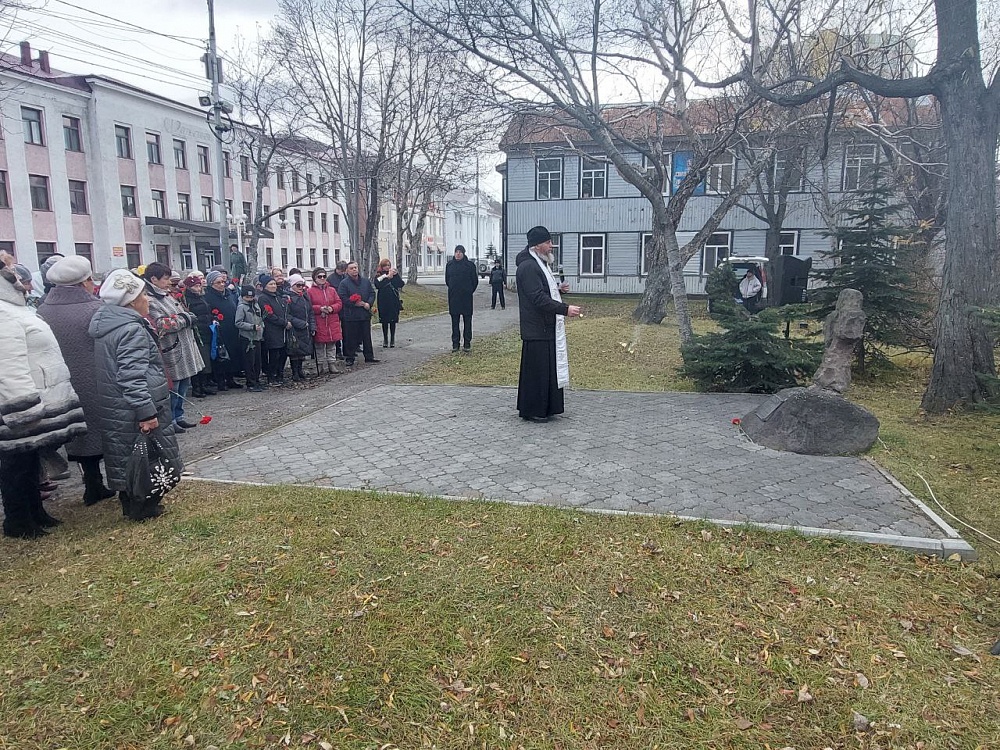 В гражданской панихиде у мемориального комплекса в центре Петропавловска-Камчатского приняли участие представители краевого правительства, Городской Думы ПКГО и духовенства, общественники, родственники репрессированных и другие неравнодушные горожане.