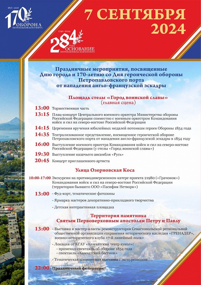 В этом году все праздничные мероприятия, посвящённые Дню города, совмещены с мероприятиями в честь 170-летия героической обороны Петропавловского порта от нападения англо-французской эскадры.